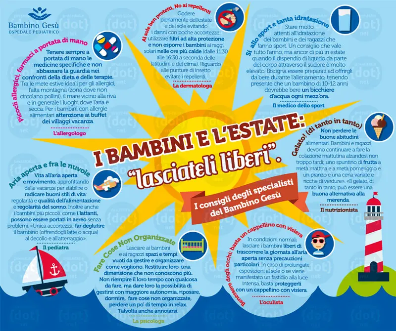 Al mare, in montagna o in città, il vademecum degli esperti dell’Ospedale Pediatrico Bambino Gesù per affrontare con serenità l’estate in compagnia dei propri figli. Tanti i consigli per i genitori: dalle punture delle zanzare a quelle delle meduse, dall’alimentazione all’abbigliamento.