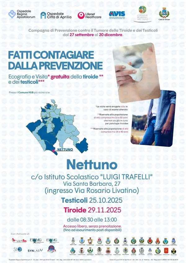 ALBANO LAZIALE (RM) – Prosegue a Nettuno, Comune HUB della manifestazione Contagiosa 2025, la Campagna di Prevenzione Oncologica gratuita dedicata alla salute dei testicoli e della tiroide, promossa dagli Ospedali Regina Apostolorum di Albano Laziale e Città di Aprilia, parte del Gruppo Lifenet Healthcare, con il patrocinio della Presidenza del Consiglio Regionale del Lazio.